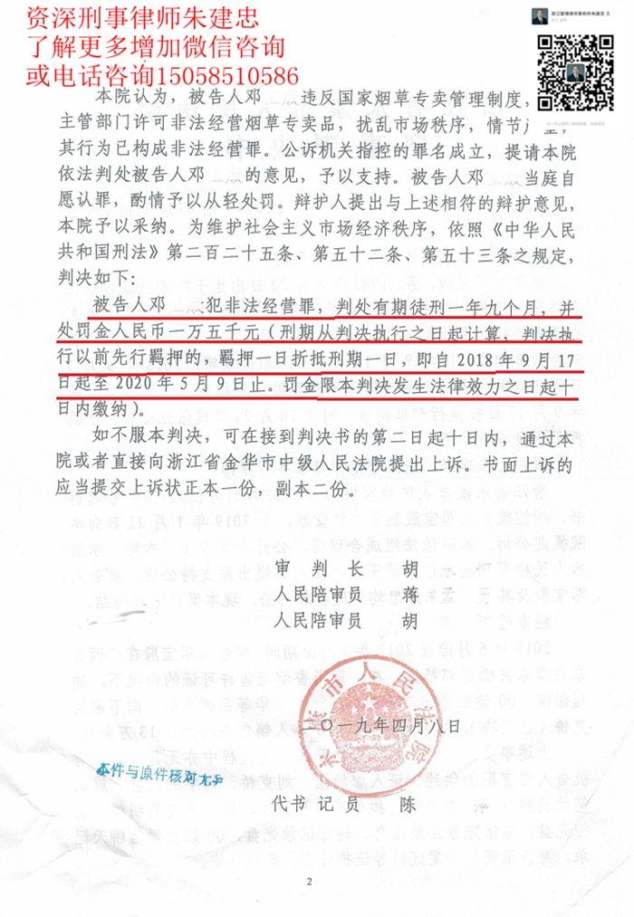 邓某销售假烟案,涉嫌非法经营罪被永康某派出所异地抓获,浙江婺博律师事务所主任朱建忠接受委托后,为其积极联系办案民警和检察官,经过多次沟通和奔波,永康检察院同意为其办理了取保候审,并且缴纳了2万元保证金。