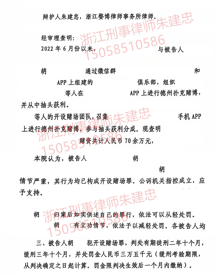 胡某某与他人合伙开设赌场一案,案件进入审查起诉阶段,胡某某取保候审在外。2024年2月7号,离除夕还有2天,胡某某接到办案单位(公安)电话通知,要其年后初九到公安报到,准备执行检察院的逮捕命令,胡某某为了防止进看守所后再找律师困难,于2024年2月7日当天聘请浙江婺博律师事务所朱建忠律师担任其审查起诉和一审阶段辩护人。